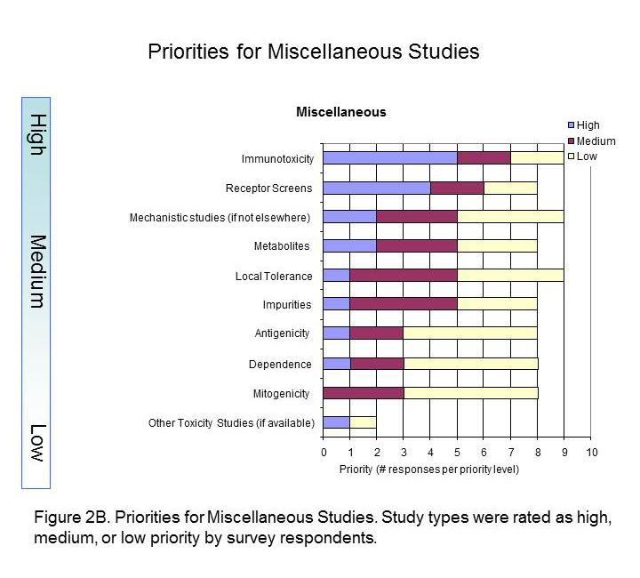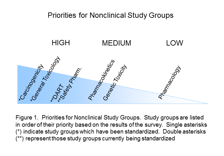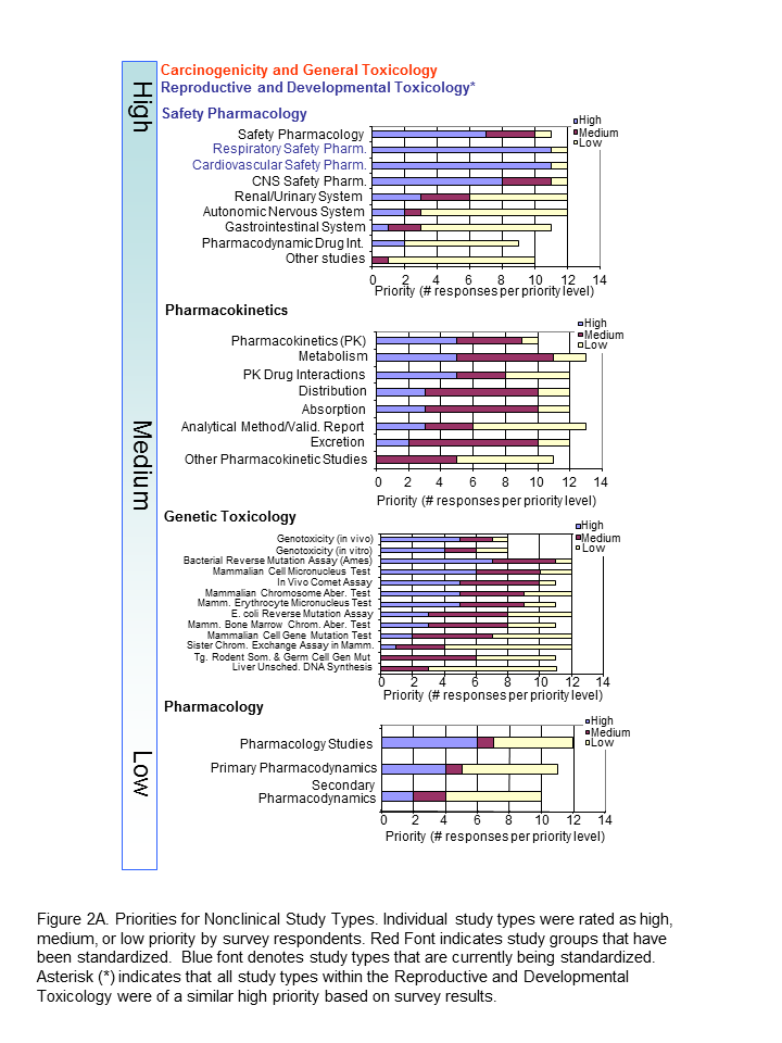 The Standards Roadmap Team created a survey for members of industry to understand the priorities of the many stakeholders of nonclinical data. We asked them to consider the entire expanse of nonclinical studies listed for Module 4 of the eCTD. Responders rated the study types with a scale of high, medium, or low priority or had the option of leaving it blank (indicative of no preference). A spot to comment on rationale for the preference was provided. Finally, responders were asked to indicate whether they were responding as an individual or on behalf of their organization. Results Respondents consisted of both companies/institutions (n=4) and individuals (n=11) throughout industry. Overall, there was no significant difference between company and individual respondents. The results of the survey indicated that Carcinogenicity and General Toxicology were the highest priority study groups (Figure 1). This was not surprising and supports previous decisions by the SEND team to standardise these first. Developmental and Reproductive Toxicology (DART) and Safety Pharmacology were rated the next highest priorities. Indeed, standards for these two study groups are currently being developed. Pharmacokinetics studies were considered to be a medium priority, along with Genetic Toxicology studies. Respondents differed on the utility of pharmacology studies, which received both high and low priority status, hence it is labeled as lower priority in Figure 1. The Roadmap team recognised value in keeping study types grouped since conventions of standardization may be applied to several study types within a study grouping. Study types for developmental and reproductive toxicity (DART studies: Segment I, II, III) were similar in their perceived high priority. Safety Pharmacology had both high and low priorities among their study types (Figure 2A). Note that Respiratory and Cardiovascular Safety Pharmacology study types received the highest priority and are presently being standardized. CNS Safety Pharmacology also rank high, while Renal, Autonomic Nervous System and Gastro-Intestinal systems are lower. Pharmacokinetic and Genetic Toxicity study groups received high/medium scores across their respective study types. Figure 2B captures prioritisation of miscellaneous studies. Immunotoxicity and Receptor Screens were ranked highest, while all other studies take medium to lower importance. A prioritisation of several data elements which can be applied across study types is also provided in Figure 3. Respondents considered creating standards for Historical Control data, Study Design/Logistics, and Clinical Signs of highest importance. Formulation Data, Biomarker Incorporation, and Metadata content also were important for standard implementation. Survey Conclusion |